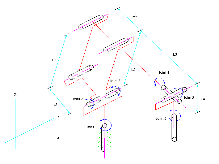 $$ T_5^4 = \begin{bmatrix} cos(\theta_5) & -sin((\theta_5)) & 0 & 0 \\ sin(\theta_5) & cos((\theta_5)) & 0 & 0 \\ 0 & 0 & 1 & 0 \\ 0 & 0 & 0 & 1 \end{bmatrix} \quad T_6^5 = \begin{bmatrix} cos(\theta_6) & -sin((\theta_6)) & 0 & 0 \\ 0 & 0 & -1 & 0 \\ sin(\theta_6) & cos((\theta_6)) & 0 & 0 \\ 0 & 0 & 0 & 1 \end{bmatrix} $$